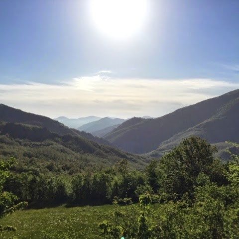 Cielo blu. Colazioni in ostello, fai da te con ogni ben di dio. Siamo le ultime a partire. Quattro chilometri di asfalto ma la vista spazia sulle catene di monti e colline dell'Appennino. Imbocchiamo un tratturo e con un salitone melmoso arriviamo al borgo di Castellonchio. Strada lastricata, fiori alle finestre e una chiesa che si affaccia sulla valle protetta da un enorme platano. Sulle case mattonelle in terracotta con la figura del pellegrino. Il cammino continua con salite e discese impervie nel bosco e in breve si arriva a Berceto. Bel paese con un duomo imponente, austero e mistico. Pausa caffè e rifornimento per il pranzo. Si è alzato un vento forte, a raffiche. Il sentiero sale al Monte Valoria in mezzo a splendidi prati fioriti. Prendiamo la deviazione per l'ostello e... all'improvviso sbucano dal bosco due caprioli! Bello! Anche questo ostello è una cantoniera dell'Anas trasformata in alloggio. Ci accoglie il simpatico gestore, Fausto, una stufa a legna che ci riscalda e un piacevole tè caldo.